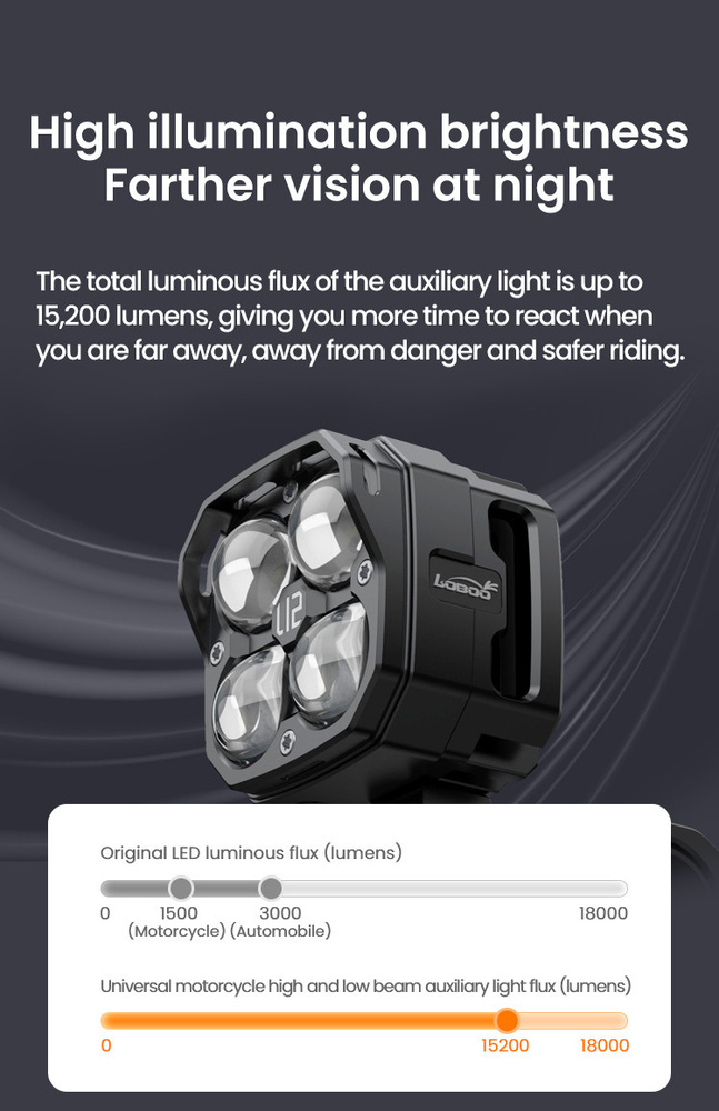 - Reflektory motocyklowe L12T Loboo to idealny wybór dla tych, którzy szukają mocy, wydajności i bezpieczeństwa. Zaprojektowane z niezależną soczewką i oddzielnym źródłem światła, reflektory te oferują zoptymalizowany kąt oświetlenia, który zapewnia wyraźną i jednolitą widoczność. Dzięki całkowitemu strumieniowi świetlnemu 15200 lumenów będziesz cieszyć się rozszerzoną widocznością w nocy, idealną do radzenia sobie nawet w najtrudniejszych sytuacjach na drodze.
