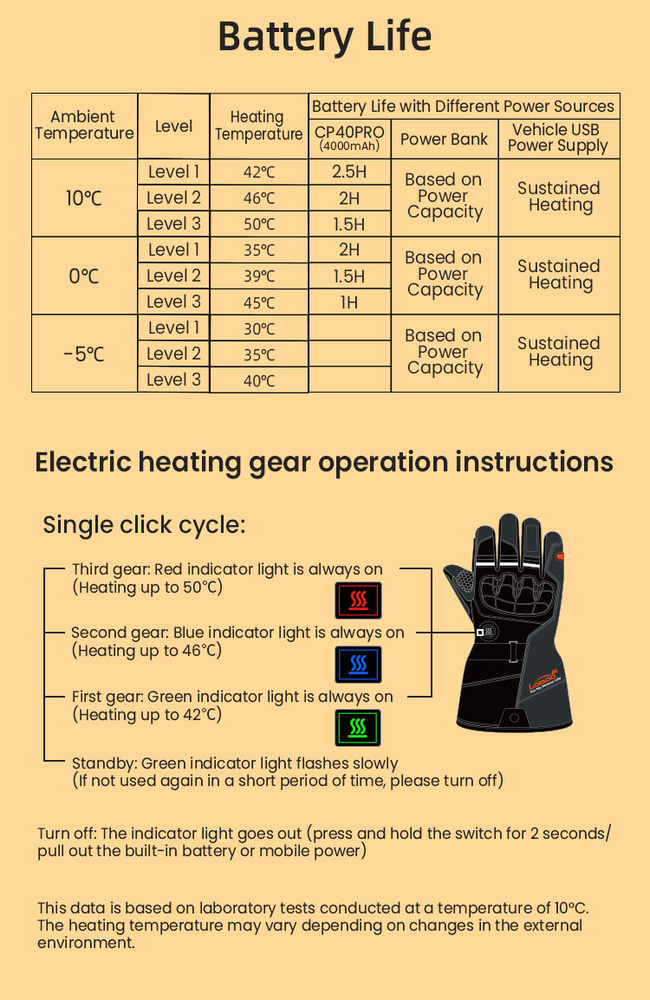 Dzięki regulowanym ustawieniom ogrzewania, wielu opcjom zasilania i zaawansowanej izolacji rękawiczki te zapewnią ciepło i ochronę dłoniom niezależnie od warunków pogodowych. Niezależnie od tego, czy korzystasz z zasilania motocykla, przenośnego powerbanku, czy specjalnej baterii do rękawiczek LOBOO, możesz cieszyć się długimi przejażdżkami bez martwienia się o żywotność baterii.