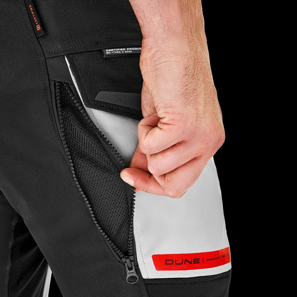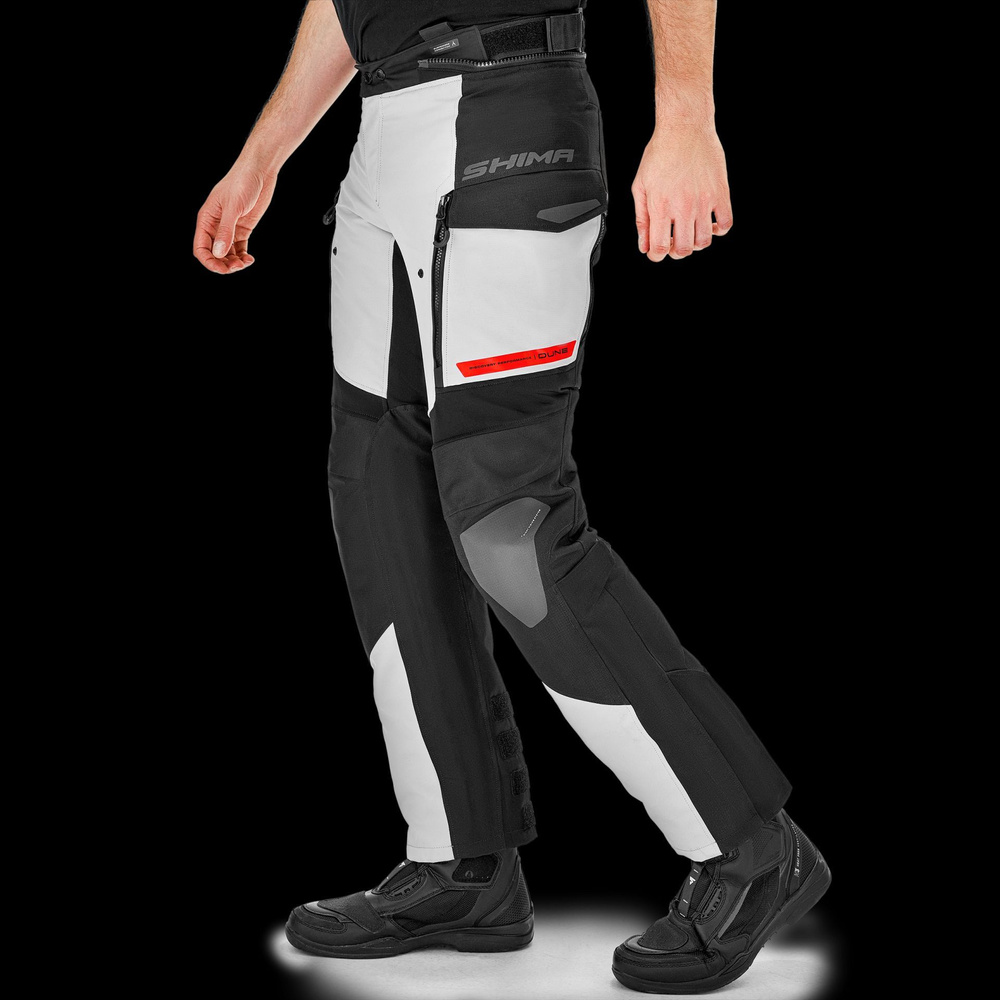 - SHIMA DUNE to turystyczne spodnie motocyklowe, stworzone do tras w różnych warunkach pogodowych. Ich kluczową cechą jest wysoki poziom bezpieczeństwa, zapewniony przez wzmocniony struktruralnie materiał typu ripstop i regulowane protektory, oraz wysoki ko